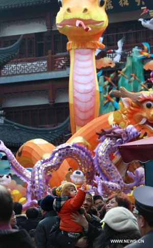 Visitors watch the lantern of snake at the Yuyuan Garden in Shanghai, east China, Feb. 20, 2013. People went to watch the lantern show at Yuyuan Garden to celebrate the coming Lantern Festival, which falls on Feb. 24 this year. (Xinhua/Pei Xin)