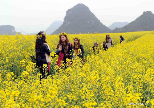 Tourists enjoy cole flowers in the field in Luoping County of Qujing City, southwest China's Yunnan Province, Feb. 21, 2013. (Xinhua/Yang Zongyou)