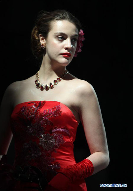 A model presents a creation at an international wedding dress show featuring 70 new designs in Shanghai, east China, Feb. 23, 2013.