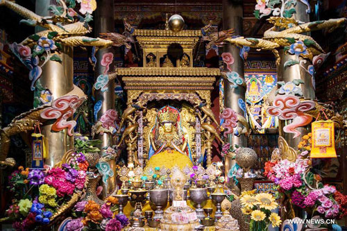 Photo taken on March 17, 2013 shows the statue of the Four-Armed Avalokitesvara at the Guanyin Temple in Jinchuan County, Aba Tibetan Autonomous Region, southwest China's Sichuan Province. The temple was first build in the seventh century and hosts the shrine to the Four-Armed Avalokitesvara boddhisattva. (Xinhua/Jiang Hongjing)