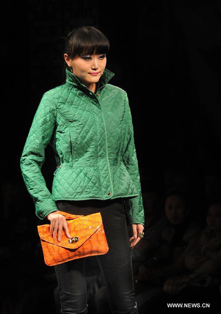 A model presents a creation during a wool warm wear fashion show in Xi'an, capital of northwest China's Shaanxi Province, March 18, 2013.