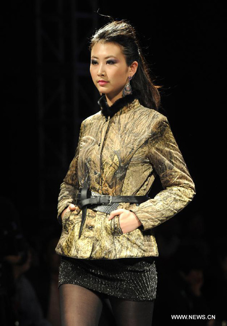 A model presents a creation during a wool warm wear fashion show in Xi'an, capital of northwest China's Shaanxi Province, March 18, 2013.
