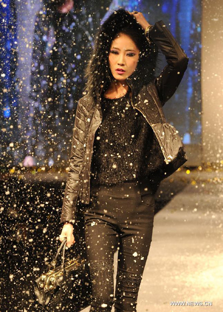 A model presents a creation during a wool warm wear fashion show in Xi'an, capital of northwest China's Shaanxi Province, March 18, 2013.