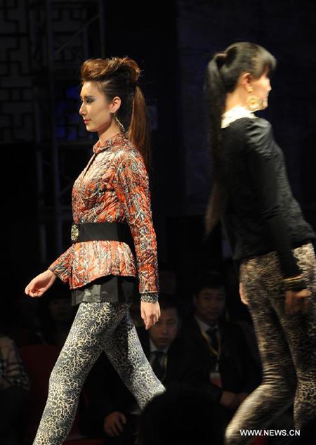 A model presents a creation during a wool warm wear fashion show in Xi'an, capital of northwest China's Shaanxi Province, March 18, 2013.