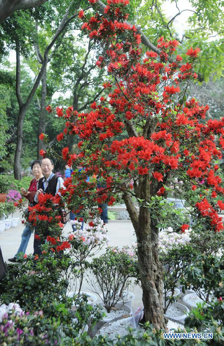 Visitors view azalea flowers at the first Fuzhou Azalea Cultural Festival in Fuzhou, capital of southeast China's Fujian Province, March 19, 2013. The festival kicked off on Tuesday, displaying over 100 species of azalea flowers.