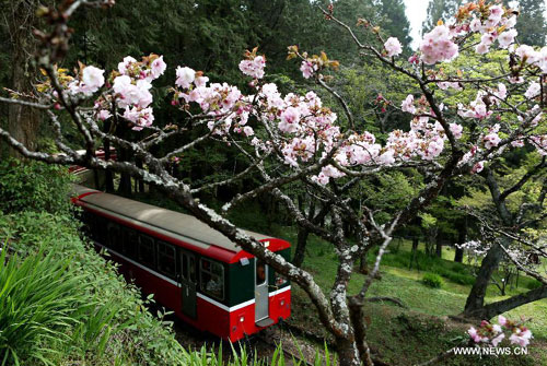 A train of the Alishan Forest Railway runs past a bunch of cherry blossoms in the Alishan Scenic Area in Chiayi, southeast China's Taiwan, March 26, 2013. (Xinhua/Xie Xiudong)
