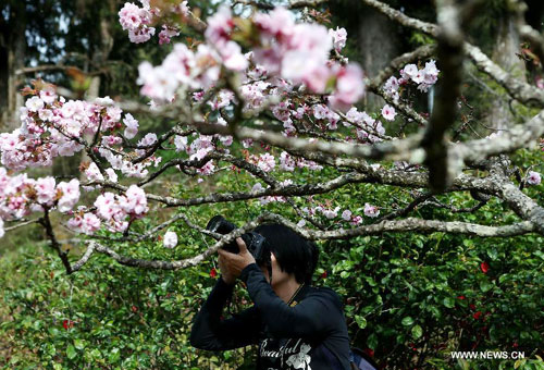 A tourist takes photos of cherry blossoms in the Alishan Scenic Area in Chiayi, southeast China's Taiwan, March 26, 2013. (Xinhua/Xie Xiudong)