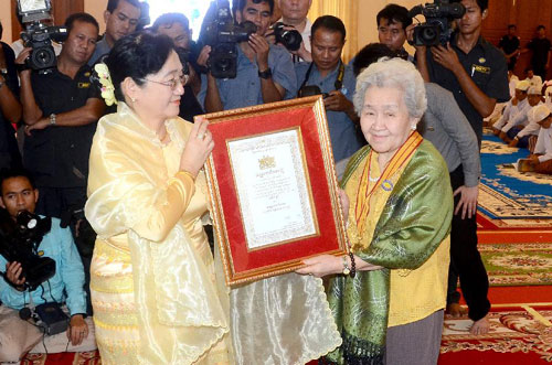 China's Myanmar language expert Su Xiuyu (front R), a professor from China's Beijing Foreign Studies University, poses for photos in Nay Pyi Taw, Myanmar, March 26, 2013. Su won one of Myanmar's highest religious medals of commendation conferred by Myanmar's President U Thein Sein here Tuesday in honor of her outstanding contribution to the cause of education, religious affairs, social welfare and China- Myanmar friendship. (Xinhua/Jin Fei)