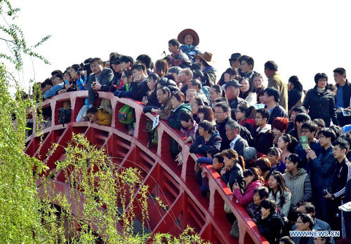 Tourists look out from a bridge at a scenic spot in Kaifeng, central China's Henan Province, April 6, 2013. Many scenic spots around Kaifeng were overcrowded by visitors who came to enjoy leisure time during the Qingming Festival holiday. (Xinhua/Wang Song)