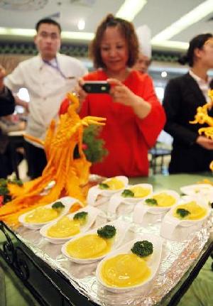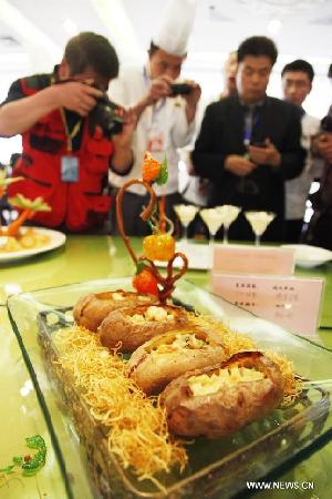 A visitor takes photos of a dish made of potatoes during a potato festival in Tengzhou City, east China's Shandong Province, April 13, 2013. |