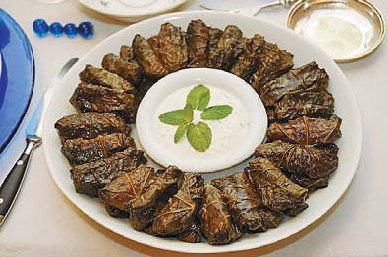 Rinse the grape leaves in cold water. If fresh, drop them in boiling water and boil for three minutes. Strain and rinse in cold water. In the center of each leaf (shiny surface of leaf downward) place a heaped teaspoonful of the filling. Fold ends of leaf over the filling and roll up leaf.