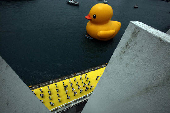 A police band performs as Rubber Duck by Dutch conceptual artist Florentijn Hofman floats near Ocean Terminal at Hong Kong's Victoria Harbour May 2, 2013.[Photo/Agencies]