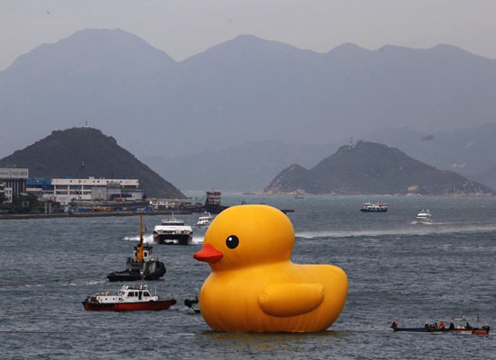 Rubber Duck by Dutch conceptual artist Florentijn Hofman floats in front of a hilly skyline at Hong Kong's Victoria Harbour May 2, 2013. The 16.5-meter-high inflatable sculpture, which made its first public appearance in the territory on Thursday, will be shown at the Ocean Terminal for a month. [Photo/Agencies]