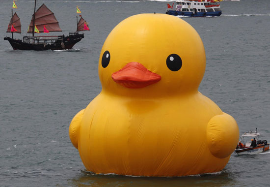 A traditional Chinese tourist junk sails past Rubber Duck by Dutch conceptual artist Florentijn Hofman at Hong Kong's Victoria Harbour May 2, 2013. [Photo/Agencies]