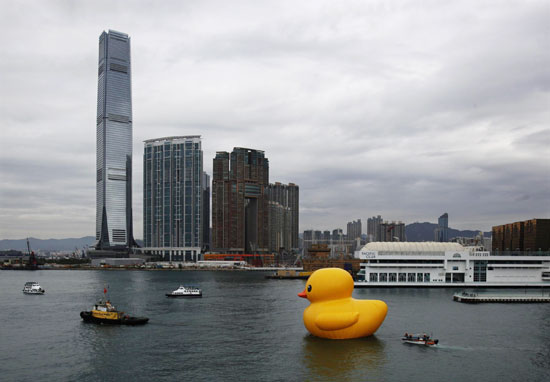 Rubber Duck by Dutch conceptual artist Florentijn Hofman floats at Hong Kong's Victoria Harbour, with the city's highest skyscaper, the 484-metre International Commerce Centre, looms at the background May 2, 2013. The 16.5-meter-high inflatable sculpture, which made its first public appearance in the territory on Thursday, will be shown at the Ocean Terminal for a month. [Photo/Agencies]