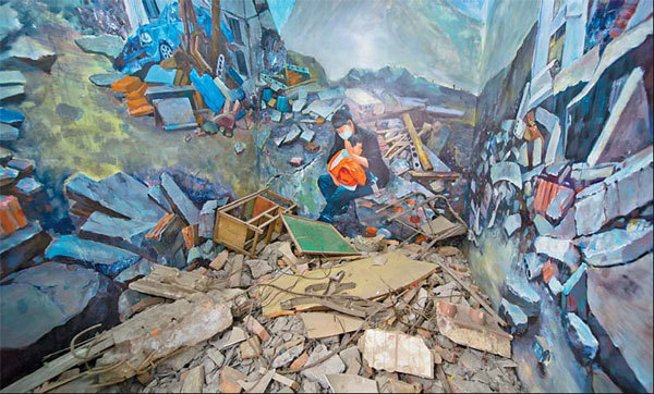 Paintings and rubble from the Wenchuan earthquake are displayed. Provided to China Daily