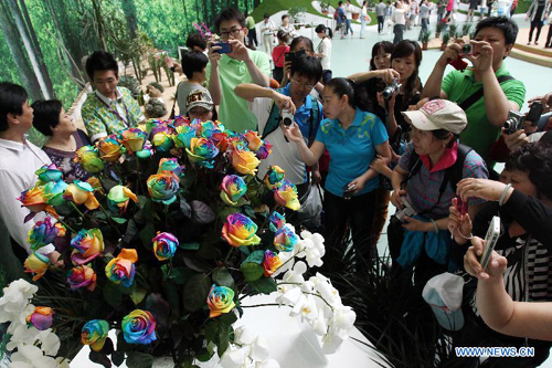 Visitors watch the colorful roses in the main exhibition hall during the 9th China (Beijing) International Garden Expo in Beijing, capital of China, May 18, 2013. The expo opened in southwestern Fengtai district in Beijing on Saturday and will last till Nov. 18, 2013. Garden designs from 69 Chinese cities and 29 countries will be presented. (Xinhua/Yang Le)