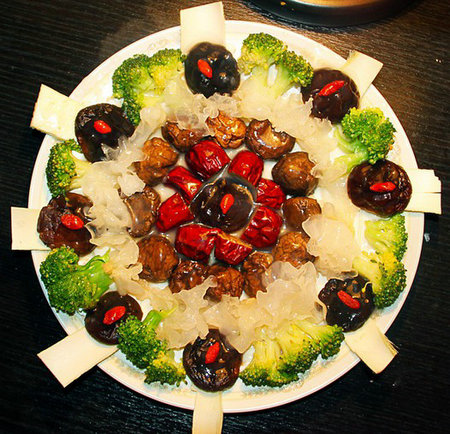 A senior monk at the Qingyun Temple on Dinghu Mountain of Zhaoqing City, Guangdong Province was the originator during the Ming Dynasty (1368-1644) of the Dinghu-style vegetarian dish. Mushrooms are the dish’s main ingredients – dried mushrooms, straw mushrooms and whatever others are available. The dish also contains tremella, dried bamboo shoots and is cooked in spring water. When ready to serve the dish has a mouthwatering aroma, fresh, bright colors and is sweet and crisp to taste.