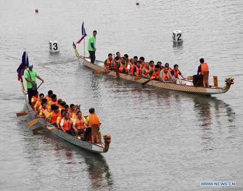 Participants compete in a dragon boat race during a dragon boat carnival on the Qinhuai River in Nanjing, capital of east China's Jiangsu Province, June 2, 2013. The event was held as a means to celebrate the upcoming Dragon Boat Festival, or Duanwu Festival, which falls on the fifth day of the fifth month in the Chinese lunar calendar, or June 12 this year. (Xinhua/Li Wenbao)
