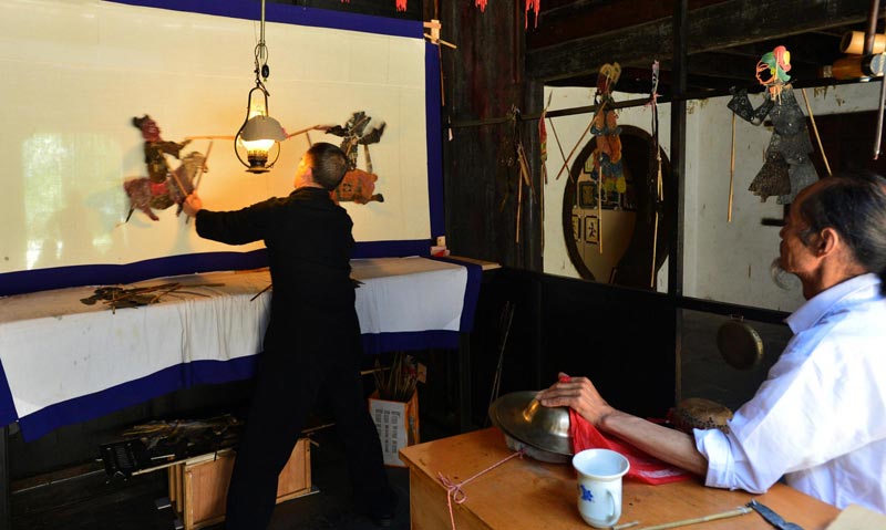 Two experts of the intangible heritage shadow play art perform for audiences at the Mount Phoenix scenic area in Zigui county, Hubei province, June 2, 2013. (Xinhua)