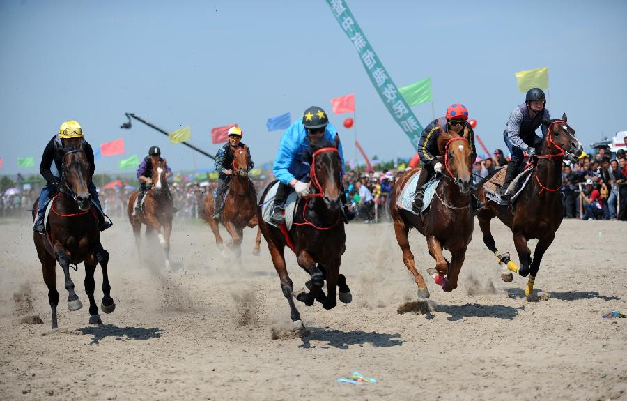 Herdsmen of the Ewenki ethnic group participate in a horse race at the annual Sebin (Happiness) Festival in Owenke Autonomous Banner, north China's Inner Mongolia Autonomous Region, June 18, 2013. The Ewenki ethnic group has the reputation of the "last hunting tribe in China". [Xinhua/Liu Yongzhen]