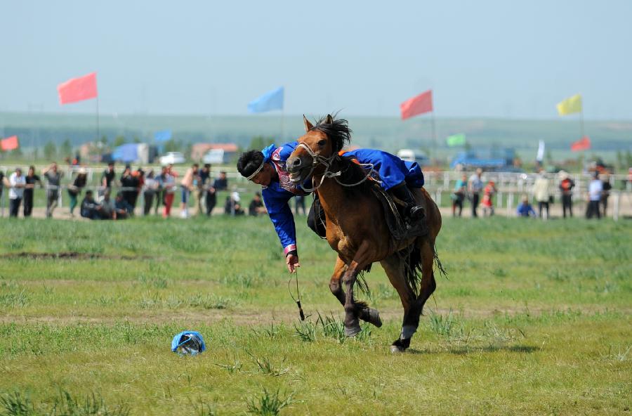 A herdsman of the Ewenki ethnic group performs at the annual Sebin (Happiness) Festival in Owenke Autonomous Banner, north China's Inner Mongolia Autonomous Region, June 18, 2013. The Ewenki ethnic group has the reputation of the "last hunting tribe in China". [Xinhua/Liu Yongzhen]