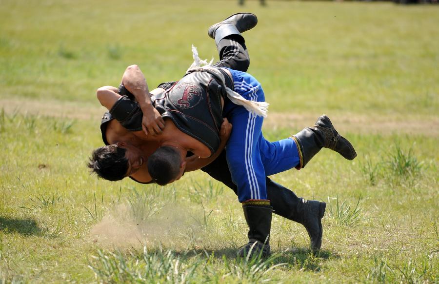 Herdsmen of the Ewenki ethnic group wrestle at the annual Sebin (Happiness) Festival in Owenke Autonomous Banner, north China's Inner Mongolia Autonomous Region, June 18, 2013. The Ewenki ethnic group has the reputation of the "last hunting tribe in China". [Xinhua/Liu Yongzhen]