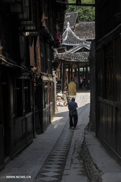 A man walks at the Zhaoxing Dong Village in Liping County, southwest China's Guizhou Province, June 20, 2013. Zhaoxing Dong Village is one of the largest Dong village in Guizhou. In 2005, it was ranked one of China's six most beautiful villages and towns by Chinese National Geography. (Xinhua/Ou Dongxu)