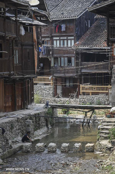 A woman of Dong ethnic group washes clothes near a brook at Zhaoxing Dong Village in Liping County, southwest China's Guizhou Province, June 20, 2013. Zhaoxing Dong Village is one of the largest Dong village in Guizhou. In 2005, it was ranked one of China's six most beautiful villages and towns by Chinese National Geography. (Xinhua/Ou Dongxu)