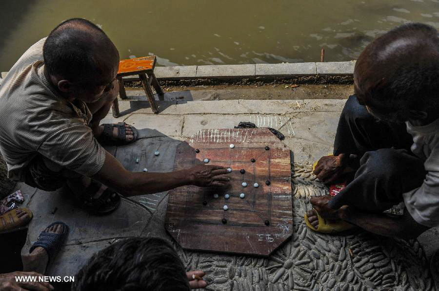People play chess near a brook at Zhaoxing Dong Village in Liping County, southwest China's Guizhou Province, June 20, 2013. Zhaoxing Dong Village is one of the largest Dong village in Guizhou. In 2005, it was ranked one of China's six most beautiful villages and towns by Chinese National Geography. (Xinhua/Ou Dongxu)