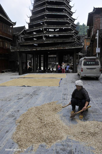 A woman of Dong ethnic group dries grain at Zhaoxing Dong Village in Liping County, southwest China's Guizhou Province, June 20, 2013. Zhaoxing Dong Village is one of the largest Dong village in Guizhou. In 2005, it was ranked one of China's six most beautiful villages and towns by Chinese National Geography. (Xinhua/Ou Dongxu)