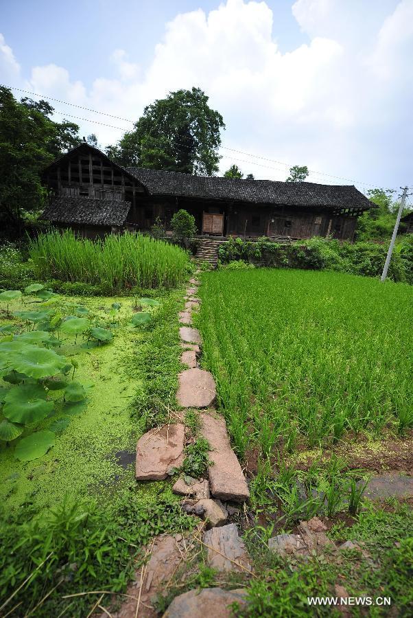Photo taken on June 16, 2013 shows the wooden Diaojiaolou, or stilted houses in Shiyanping village, Wangjiaping township of Zhangjiajie city in Central China's Hunan province. The Shiyanping village, located in the Southeast of Wangjiaping, is one of the regions in Hunan where stilted houses are well preserved. With a toal of 182 existing stilted houses of the Tujia ethnic group, the village was listed as the seventh batch of important heritage sites under state protection in 2013. [Photo/Xinhua]
