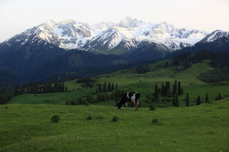 A cow grazes leisurely at the foot of Yili Snow Mountain.[Photo/Crienglish.com]