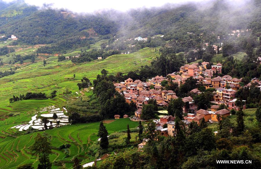 Photo taken on June 28, 2013 shows the village buildings and terraced fields in Yuanyang County of Honghe Prefecture in southwest China's Yunnan Province. The UNESCO's World Heritage Committee inscribed China's cultural landscape of Honghe Hani Rice Terraces onto the prestigious World Heritage List on June 22, bringing the total number of World Heritage Sites in China to 45. (Xinhua/Chen Haining)