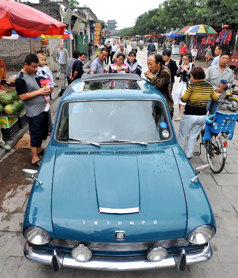Local people view a Triumph 1300 made in 1967 in Pingyao, north China's Shanxi Province, July 10, 2013. [Photo: Xinhua]