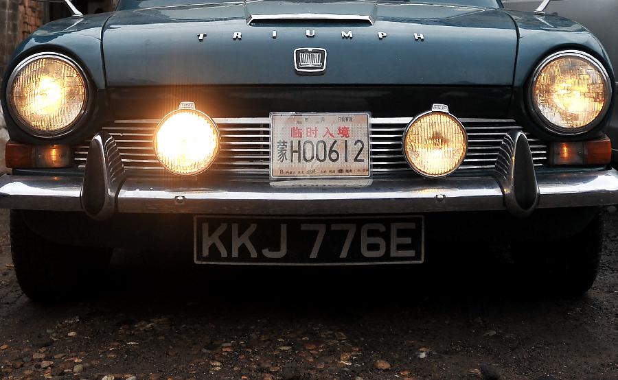 This picture shows the entry license plate sticking on a Triumph 1300 made in 1967, in Pingyao, north China's Shanxi Province, July 10, 2013. [Photo: Xinhua]
