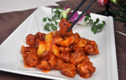 The pork, after being tenderized by the acid in vinegar and then deep-fried, is crisp outside and juicy inside. Soy sauce adds more roundness to the rich dish that has a balance of sweet and sour taste.