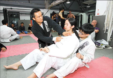 After some warm-up exercises like sit-ups and push-ups, a coach demonstrates some basic defense moves to the trainees. He teaches mostly in English, but also explains some skills in Mandarin so Chinese trainees understand clearly. All of them are sweating. They are learning Brazilian jiu-jitsu from coach Stanley Tam, a Hong Kong-born Australian who founded Shanghai Brazilian Jiu-jitsu (SHBJJ) nine years ago. Now SHBJJ has several branches in town and around 120 students.