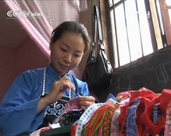 As dawn breaks, Wu Jiangmei's day begins. She ties her hair back and gets dressed. The "flowerbag" on the table needs a few final stitches to complete. This small bag is stitched together by pieces of colourful cloth and filled with beans or seeds. Before long, the "flowerbag" will be in the hands of a young man.