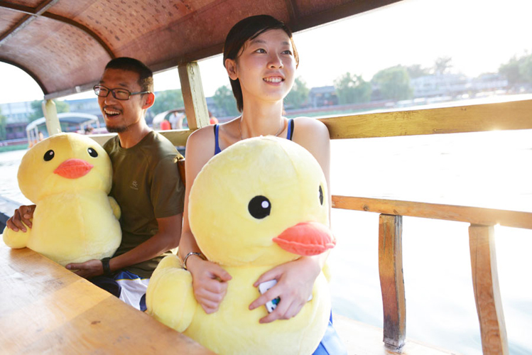 The popular giant yellow duck that has been touring China will visit Beijing in September. Where the duck will stay has not been decided, but the event "Welcome to Beijing, Yellow Duck" currently underway in the Shichahai area, will run through September 15. Plush and yellow duck rubber toys are already in the area. One employee with the event said they hope the yellow duck will come to the Shichahai area through visitor photos and Weibo posts so everyone can enjoy the event.[Photo/Xinhua]