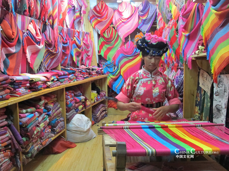 A girl of Mosuo, a matriarchal tribe that resides at and around Yunnan's Luguhu Lake, is waving a scarf in the Old Town of Lijiang, Yunnan province. [photo by Yang Qi/chinaculture.org]
