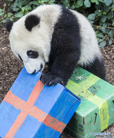 Giant panda cub Xiao Liwu plays with gift boxs during his first birthday celebration at the San Diego Zoo, California, the United States, July 29, 2013. Zoo staff made a cake with ice, bamboo and some of the cub's favorite fruits and also boxes wrapped as gifts. The cub Xiao Liwu was born on July 29, 2012, as the sixth baby of its mother Bai Yun. [Photo/Xinhua]