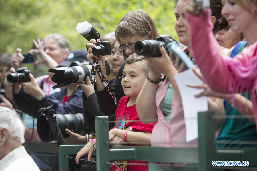 Tourists watch giant panda cub Xiao Liwu during his first birthday celebration at the San Diego Zoo, California, the United States, on July 29, 2013. Zoo staff made a cake with ice, bamboo and some of the cub's favorite fruits and also boxes wrapped as gifts. The cub Xiao Liwu was born on July 29, 2012, as the sixth baby of its mother Bai Yun. [Photo/Xinhua]