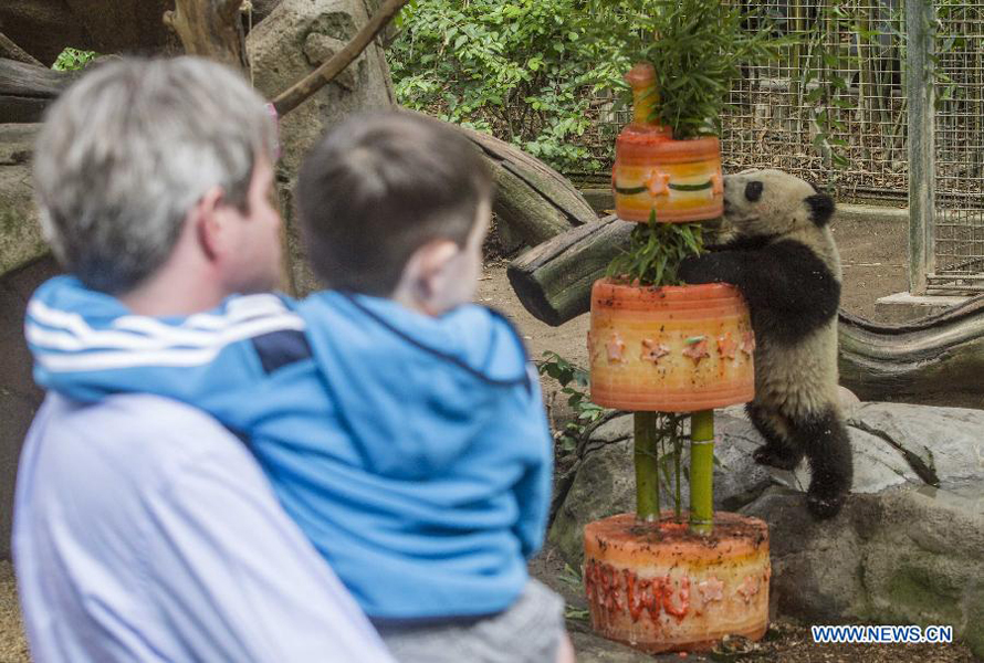 Giant panda cub Xiao Liwu plays with gifts during his first birthday celebration at the San Diego Zoo, California, the United States, July 29, 2013. Zoo staff made a cake with ice, bamboo and some of the cub's favorite fruits and also boxes wrapped as gifts. The cub Xiao Liwu was born on July 29, 2012, as the sixth baby of its mother Bai Yun. [Photo/Xinhua]