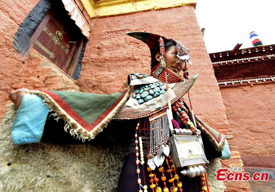 A Tibetan woman in traditional 'peacock costume' in a village of Burang County, Ngari Prefecture.(CNS/Li Lin)