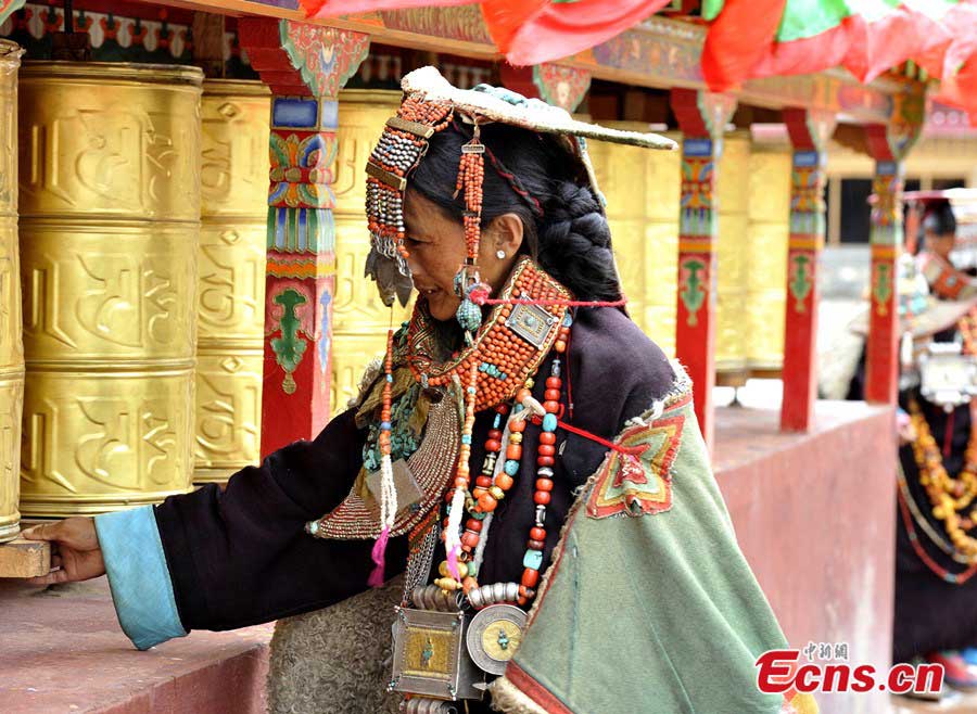 A Tibetan woman in traditional 'peacock costume' in a village of Burang County, Ngari Prefecture. Each of seven families in the village keeps such a costume handed down from hundreds of years ago. (CNS/Li Lin)