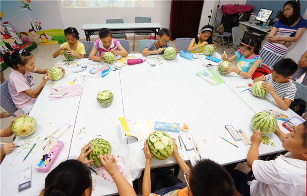 Children in the Gusu district of Suzhou, in East China's Jiangsu province, carve cartoon figures and animals on watermelons in a communicty activity on Tuesday.(China Daily/Chen Yu)