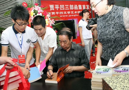 Chinese author Jia Pingwa signs copies of his book Fei Du and others for readers at a university in Xi'an in 2009. Photo: CFP