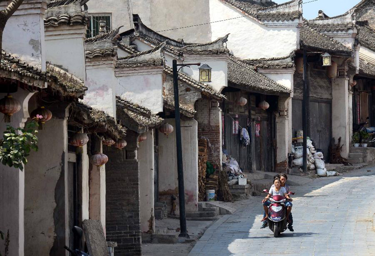 Locals ride on a street in the ancient town of Jingziguan in Xichuan county, Central China's Henan province, Aug 4, 2013. As a former local trade center located on old trade routes, the town boasts more than 700 well-preserved ancient buildings dating back to the Ming Dynasty (1368-1644) and the Qing Dynasty (1644-1911). [Photo/Xinhua]