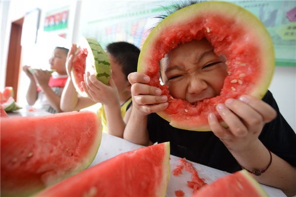 Boys in Yangzhou of East China's Jiangsu province bite pieces of watermelon on August 6 in a community activity that honors an age-old folk tradition of embracingLiqiu, one of the 24 traditional Chinese solar terms that marks the beginning of autumn.[Meng Delong/Asianewsphoto]